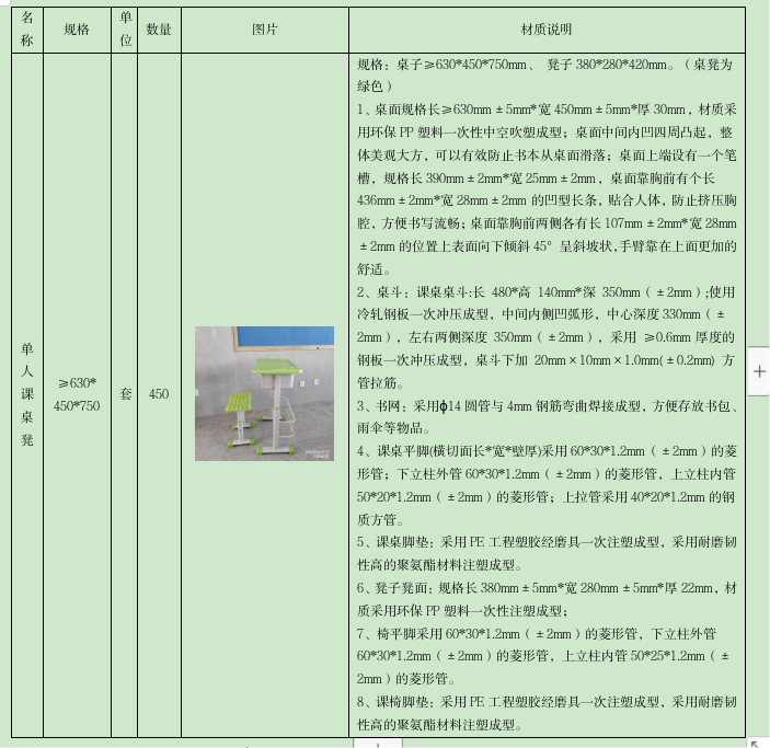 规格:桌子≥630*450*750mm、 凳子380*280*420mm。(桌凳为绿色)