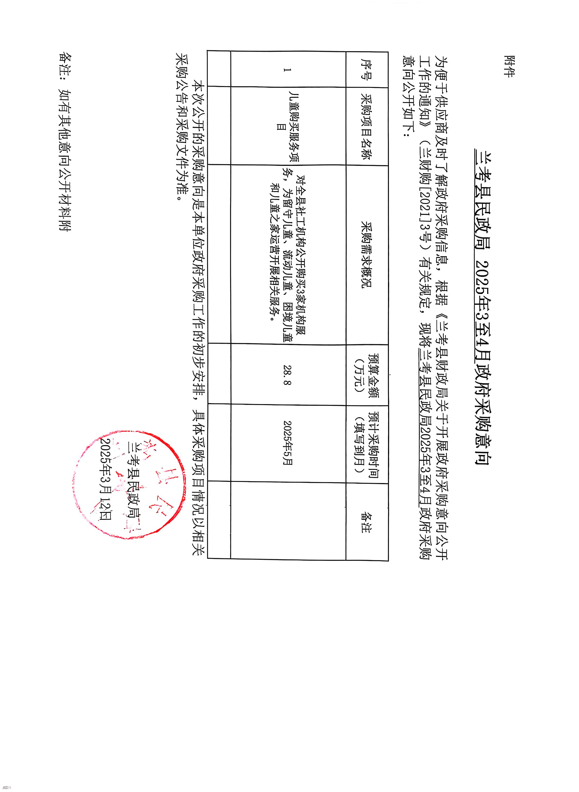 为便于供应商及时了解政府采购信息,根据《河南省财政厅关于开展政府采购意向公开工作的通知》(豫财购〔2020〕8号)等有关规定,现将兰考县民政局 2025年3(至)4月采购意向公开如下: