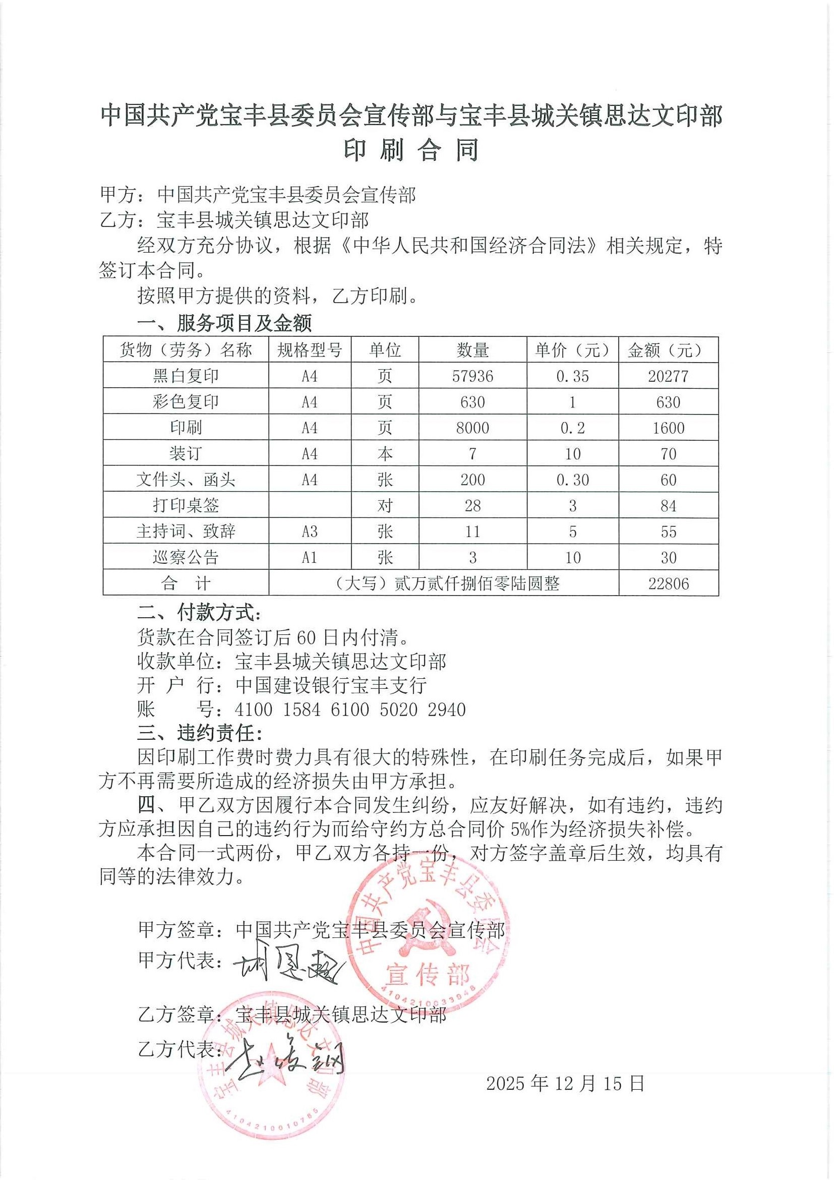 一、合同编号:宝财竞谈-2025-219-A ******宣传部文印费项目 三、项目编号:宝财竞谈-2025-219 ******宣传部文印费项目 五、合同主体 ******宣传部 地址:宝丰县城人民路西段 联系人:柴海燕 联系方式:****** 2.供应商(乙方):宝丰县城关镇思达文印部 企业规模:微型 地址:宝丰县人民路西段县委县政府对面 联系人:赵俊钢 联系方式:****** 六、合同主要信息 1、合同金额:22806 元 2、采购方式:竞争性谈判 3、履约期限、地点等简要信息: ******宣传部文印费项目 4、合同主要标的信息