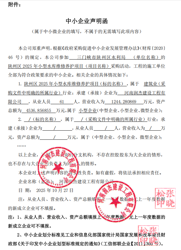 1 陕州区2025年小型水库维修养护项目 竞争性磋商文件、工程量清单、图纸及答疑纪要等列明的所有内容; 90日历天 杨迎 ******7102