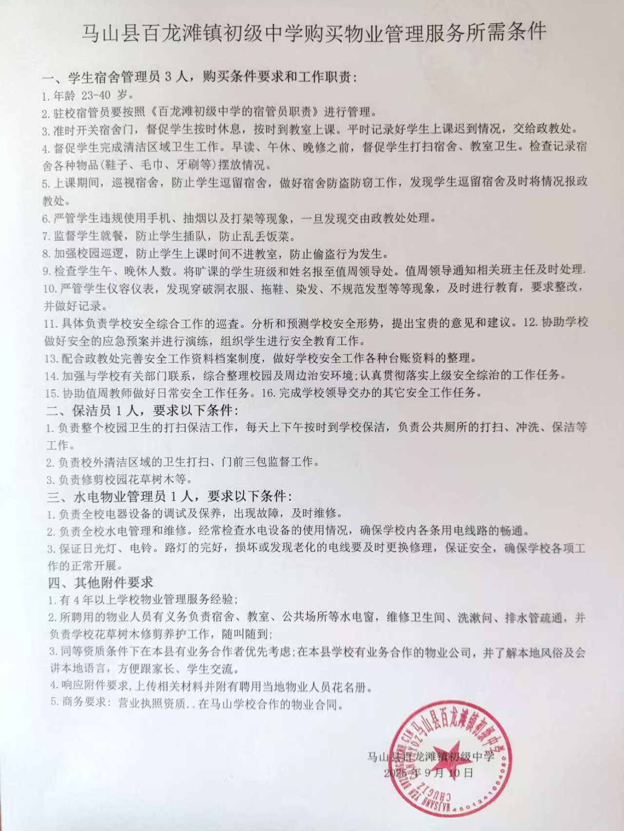 买家留言:1.要求有4年以上物业管理经验。同等条件下在马山有业务合作的优先考虑,并上传合同及相关资质材料。