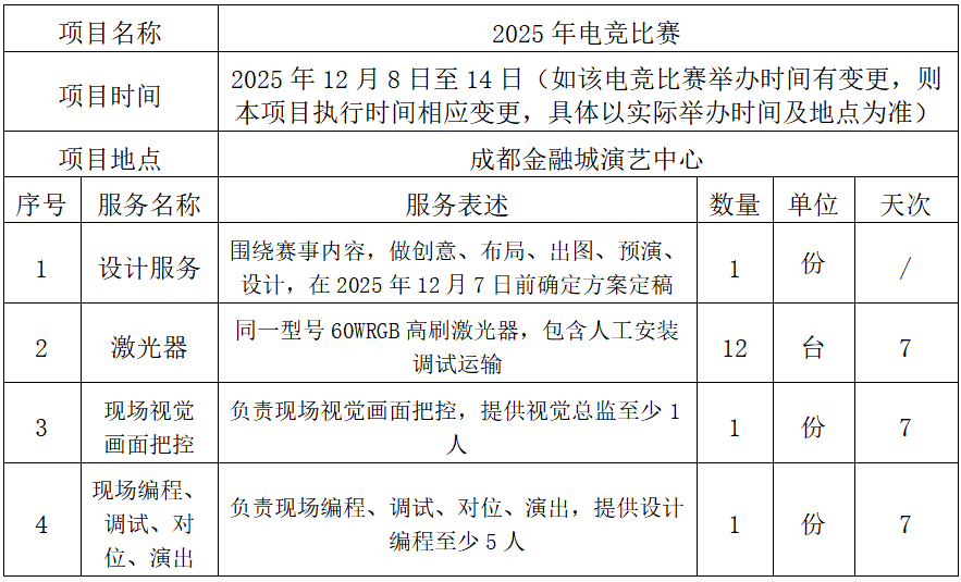 2025年电竞比赛将于12月在成都举办,我单位拟针对该电竞比赛采购相关技术服务。