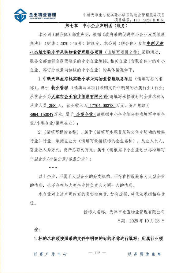 ******小学采购物业管理服务项目(项目编号:TJBH-2025-D-0151)中标结果公告