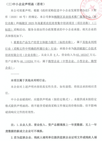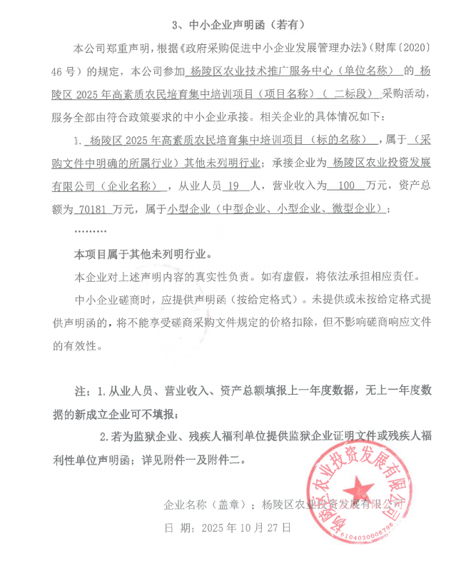 ******服务中心杨陵区2025年高素质农民培育集中培训项目中标(成交)明细.pdf 定 杨陵区2025年高素质农民培育集中培训项目 磋商文件.doc 二次报价表(一标段).pdf 二次报价表(二标段).pdf 二次报价表(三标段).pdf 二次报价表(四标段).pdf 中小企业声明函(二标段).png 中小企业声明函(三标段).png