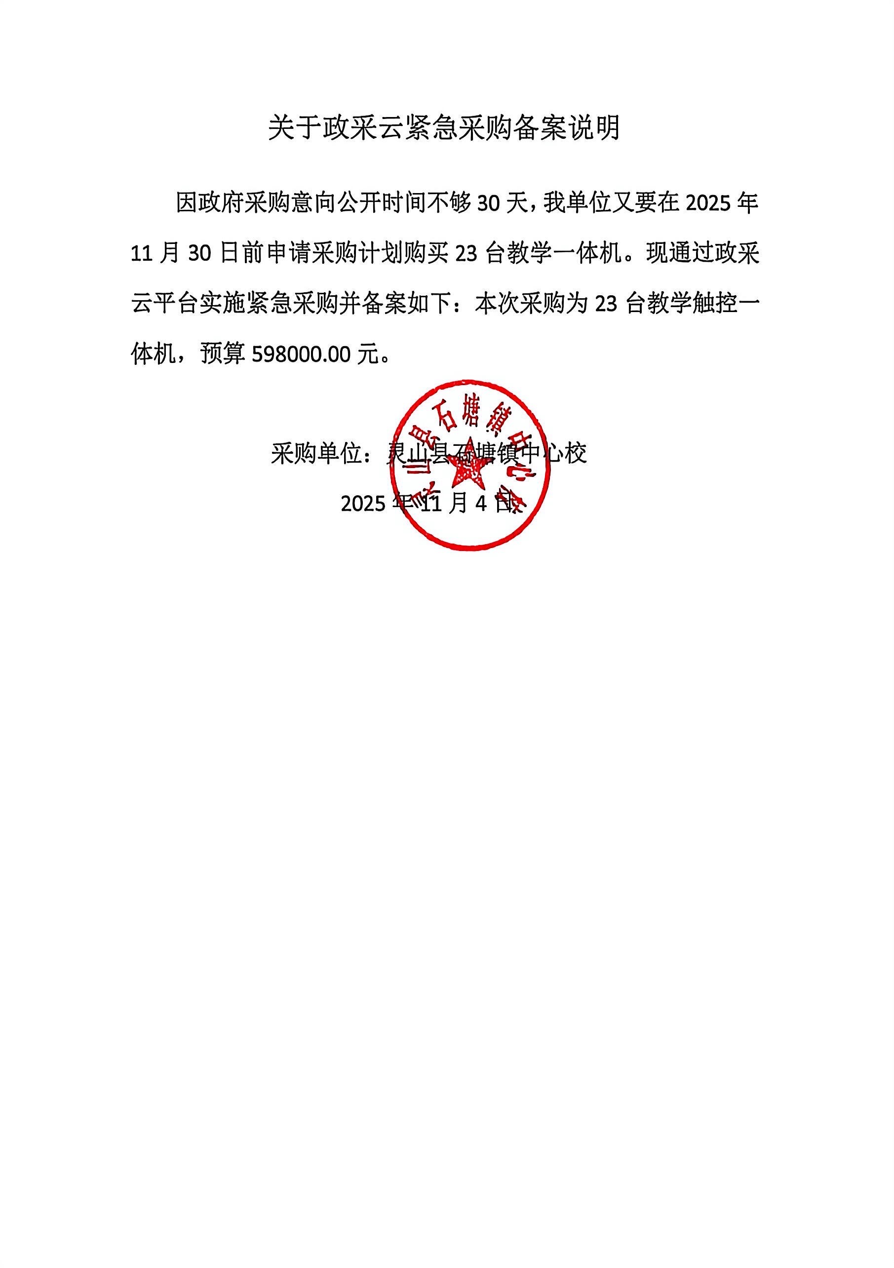 钦州市政府采购中心关于灵山县石塘镇中心校教学触控一体机(QZZC2025-J1-210280-QZSZ)的竞争性谈判公告