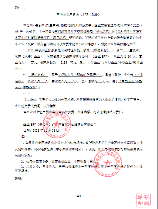 1 2025年陕州区张茅乡瓦山沟村道路提升项目 本项目磋商文件、补充文件、工程量清单、图纸及答疑纪要等列明的所有内容; 30日历天 刘敏峡 ******4461