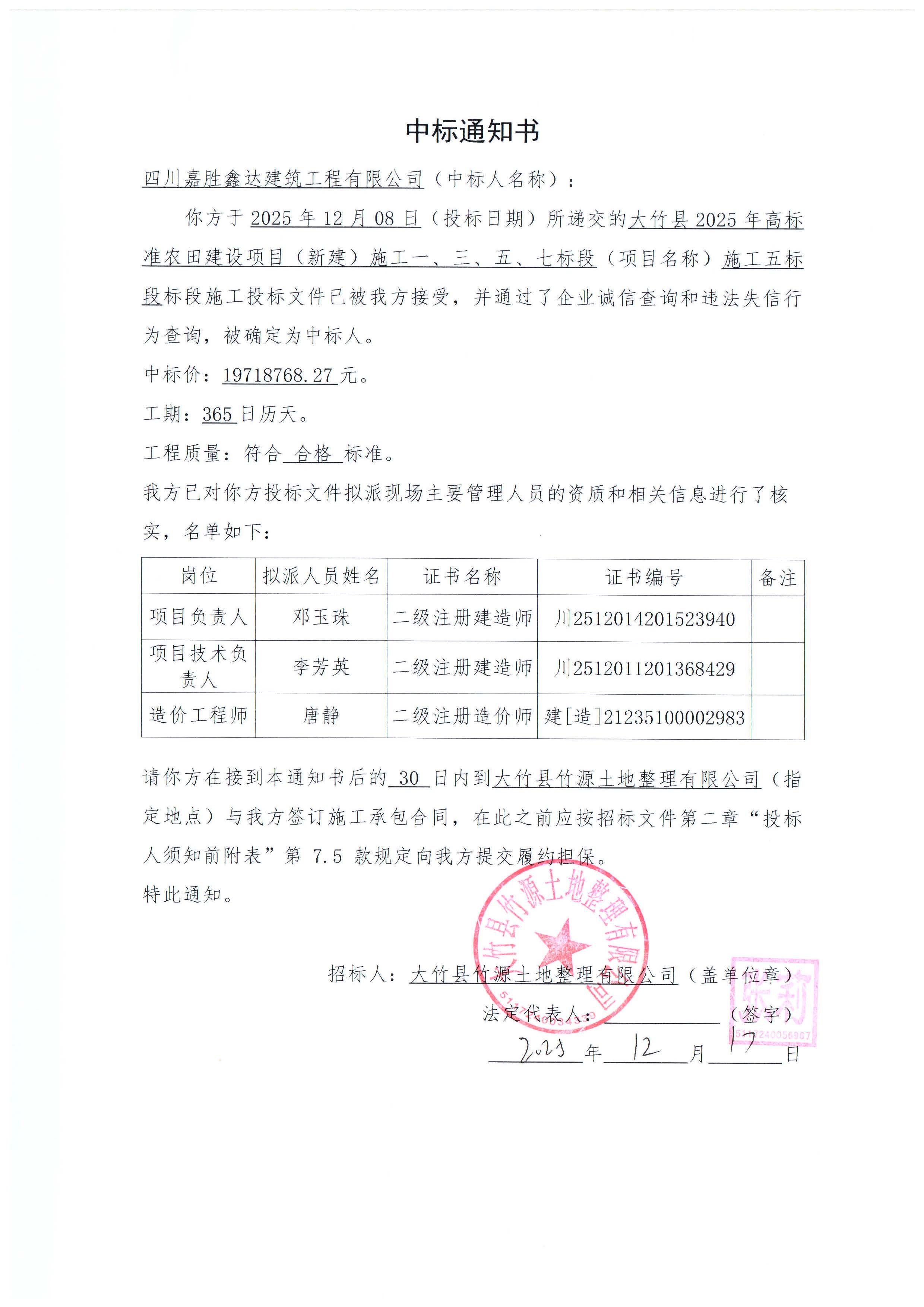 [四川省·达州市·大竹县][公开招标][施工]大竹县2025年高标准农田建设项目(新建)施工一、三、五、七标段施工五标段中标结果公示